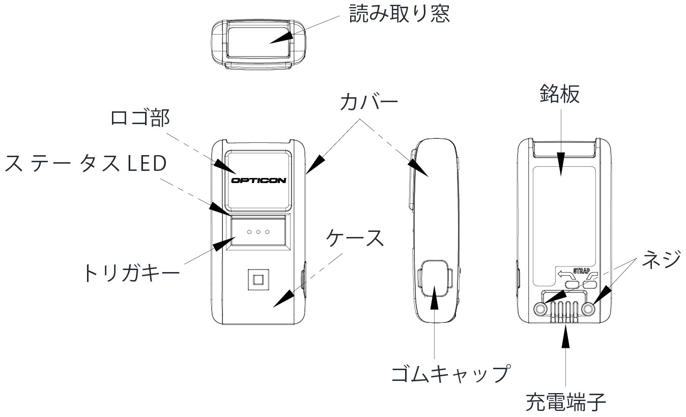 | ケース | 読み取り窓 | トリガキー | カバー | ステータス LED ゴムキャップ | 銘板 ロゴ部 | 充電端子 | ネジ | ||