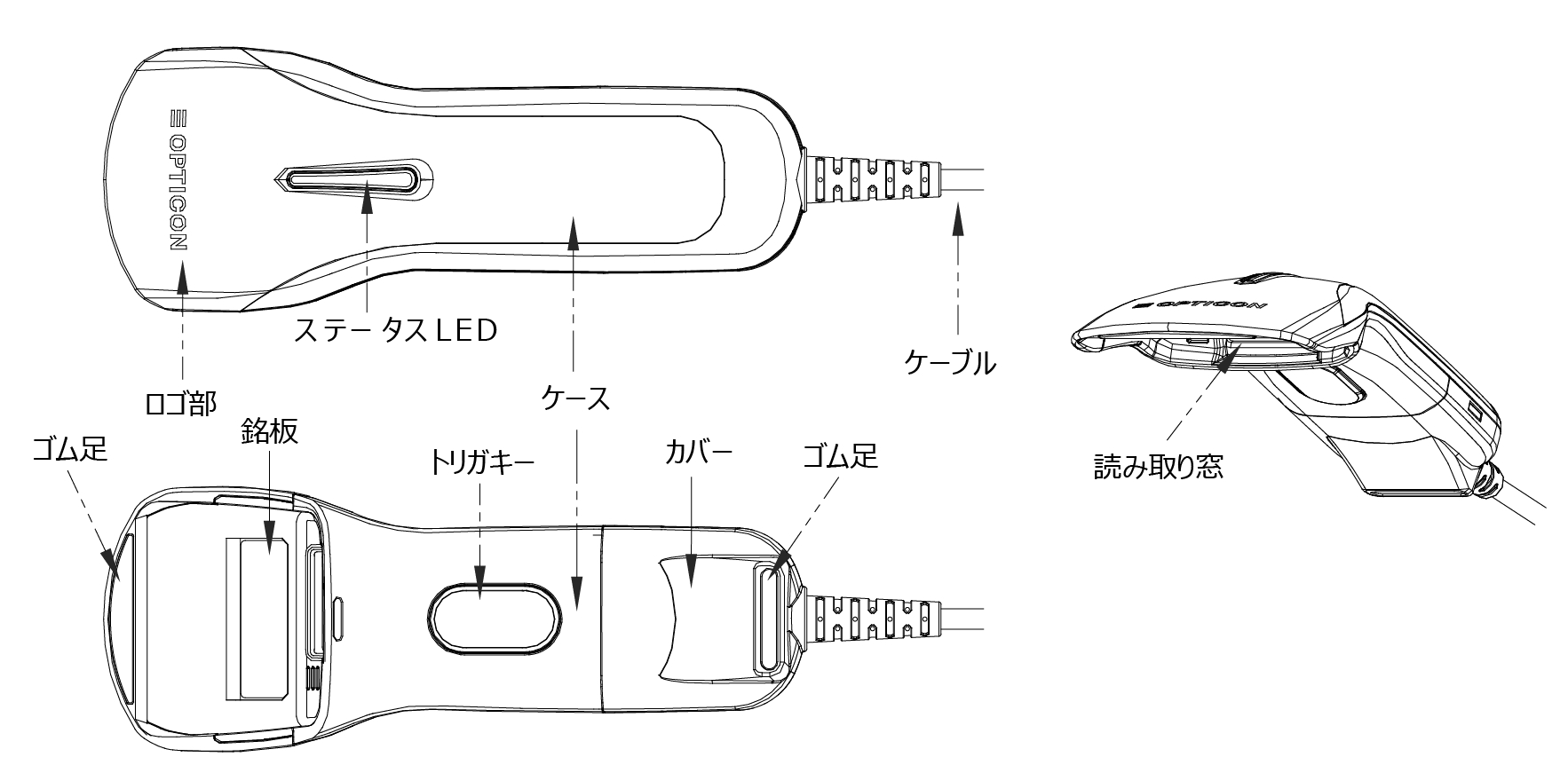 | ケースカバー | 読み取り窓 | トリガキー | ステータス LED | ケーブル | ロゴ部 銘板 | ゴム足 | ||