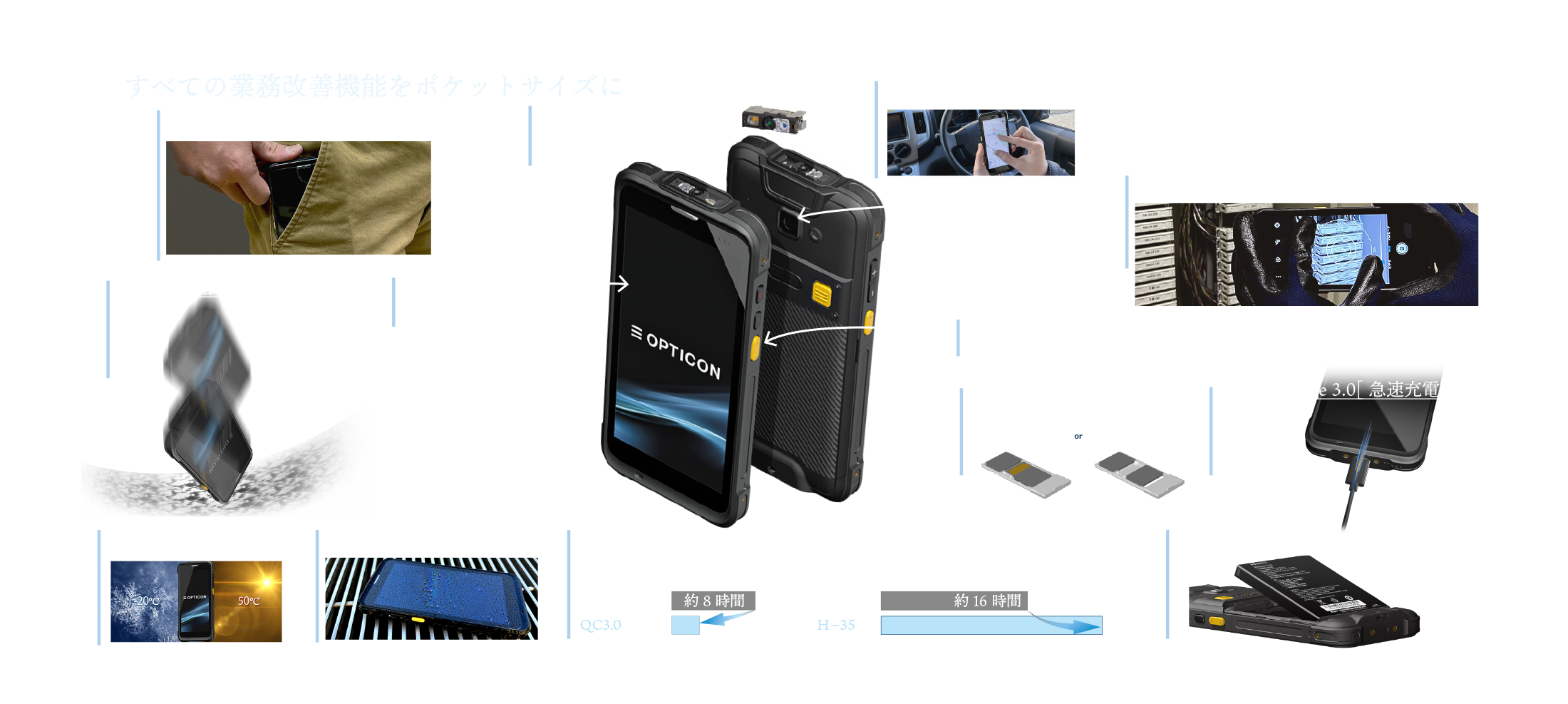 | 環境条件 | 動作時 : -20 ~ 50 ℃ (非結露、非氷結) 保存時 : -40 ~ 70 ℃ (非結露、非氷結 / バッテリを除く) |