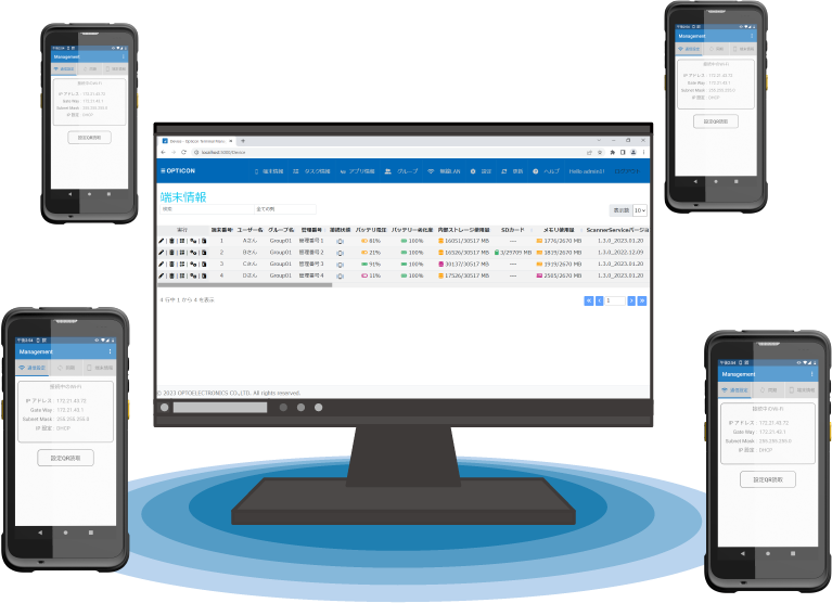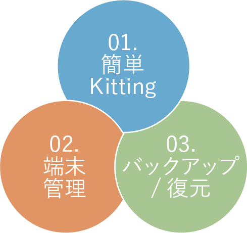 • 管理者がPCから操作することで、導入前のキッティングシート作成、稼働中の状態管理、各端末への一括配信、アプリケーションのバックアップや予備機への復元などが容易に行えます。