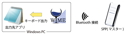 • WIMEbt は Windows OS 上で動作する常駐アプリケーションです。BluetoothSPPモード(マスター)で受信したデータを文字情報に変換し、フォーカスのあるアプリケーションに出力します。